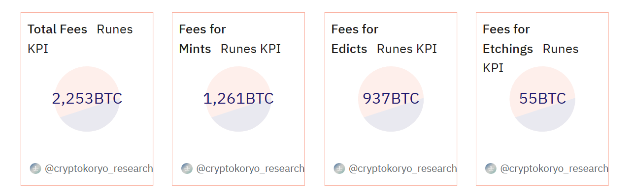 虽然交易数量的快速增长无意中增加了网络费用,但这往往对比特币矿工有利。Runes 协议在 16 天内就为矿业界带来了 2,253 BTC 的费用。