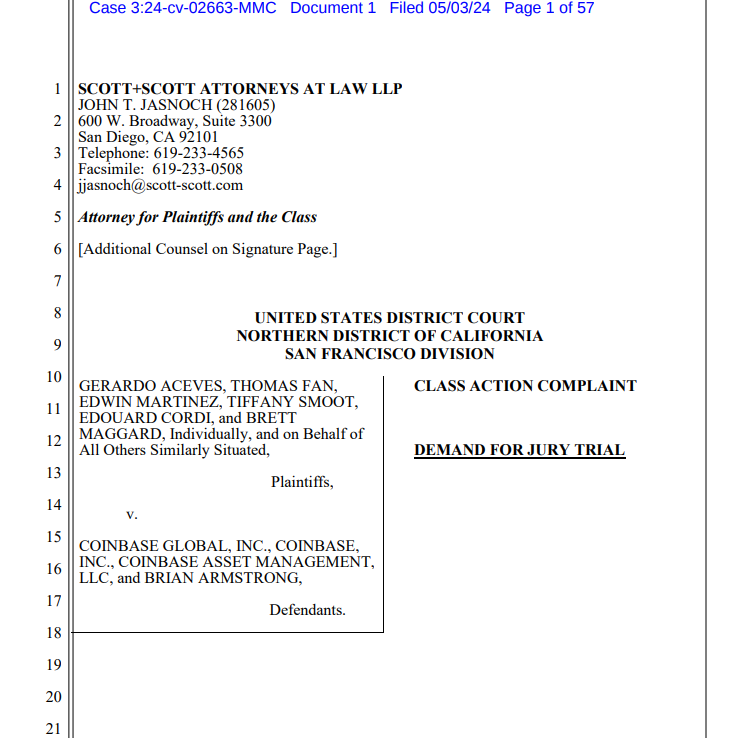 向美国加利福尼亚州北区地方法院旧金山分院提起的诉讼代表了来自加利福尼亚州和佛罗里达州的原告杰拉尔多-阿塞维斯(Gerardo Aceves)、托马斯-范(Thomas Fan)、埃德温-马丁内斯(Edwin Martinez)、蒂芙尼-斯穆特(Tiffany Smoot)、爱德华-科迪(Edouard Cordi)和布雷特-马加德(Brett Maggard),诉讼称 Coinbase 的数字资产销售从公司成立之初就故意违反了州证券法。