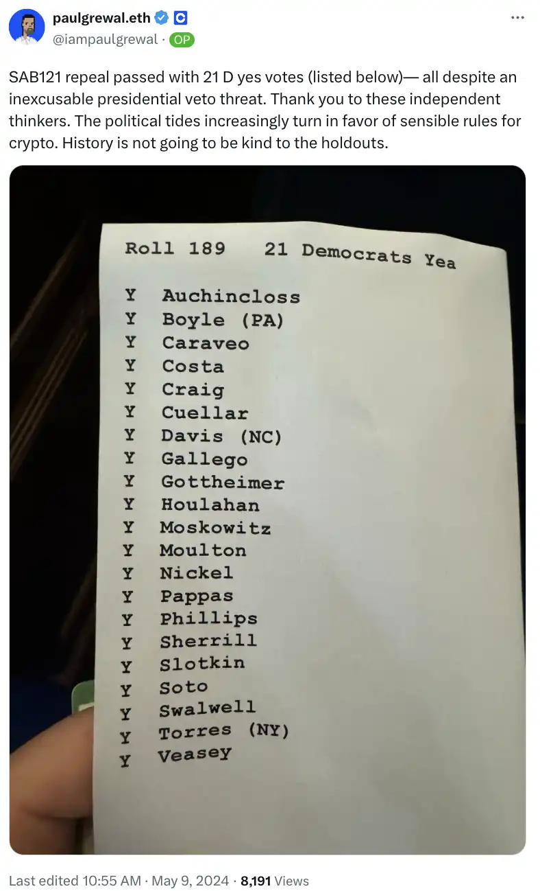 Coinbase 首席法律官 paulgrewal.eth 发表推文表示,尽管面临不可原谅的总统否决威胁,SAB121 的废除还是以 21 票 D 票赞成获得通过,「感谢这些独立思考者。政治潮流越来越有利于加密货币的合理规则。历史不会善待那些坚持不懈的人。」