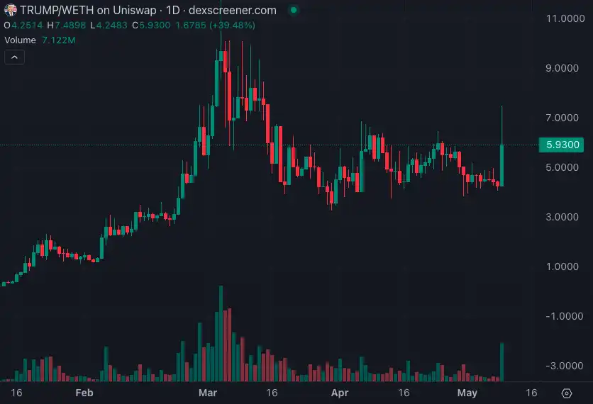 特朗普「亲加密」言论在 X 平台上疯传后,其相关 meme 币$TRUMP 也随之大涨并突破 5.9 美元,24 小时涨幅 31.73%。
