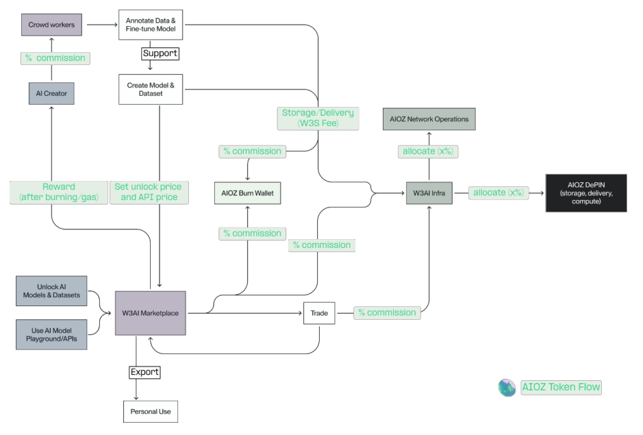 用户使用 $AIZO 进行交易费用的一部分用于AIOZ 网络运营和财务运转,确保平台的持续维护和发展。另一部分直接燃烧,帮助调节代币供应和缓解通货膨胀,这一精心设计的代币流动循环激励创新、奖励参与,并推动 AIOZ W3AI 生态系统的不断发展。