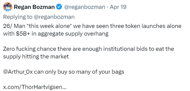 我不打算再写 47 篇推文来讨论点位、空头、高 FDV/低浮动的发行是多么愚蠢。但这种发行策略与宏观流动一样,是造成当前熊市的原因。这真的很糟糕!