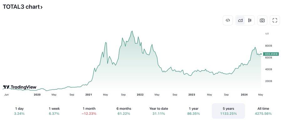 让我们来具体看看山寨的表现,Total3指数跟踪了除比特币(BTC)和以太坊(ETH )以外的前150个代币。