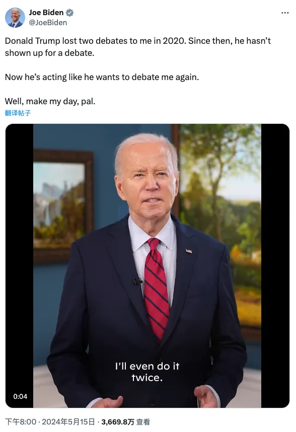81 岁的拜登在他的个人 X 账户上表示:「唐纳德·特朗普曾在 2020 年输给我两场辩论,从那之后,他就再也没有参加过辩论。现在他表现得好像他想再次与我辩论。」他接着写道:「那好吧,让我高兴高兴,伙计!」