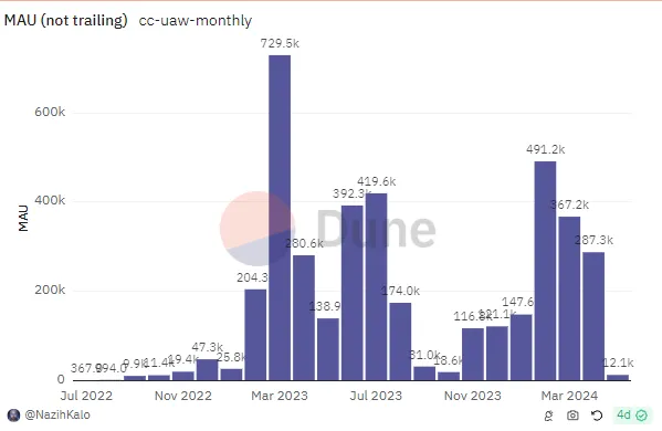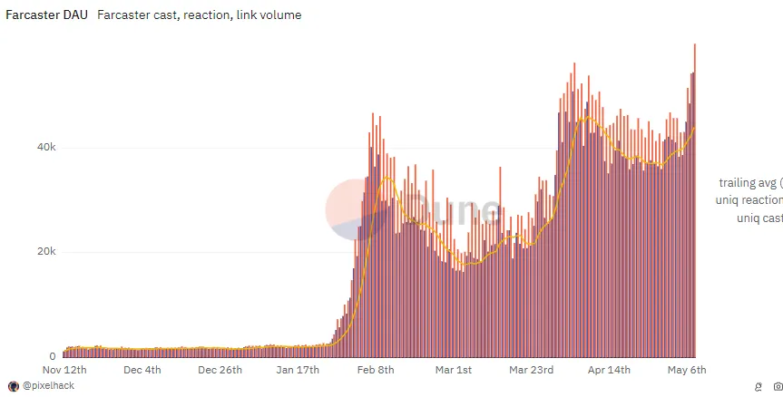 Farcaster的DAU在今年二月份开始迅速增长,三月份下滑后又涌进了更多新用户
