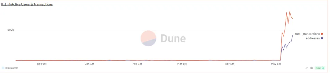 UXLINK在今年的增速异常惊人,在五月份的地址数达到了接近500K,默默来到了来到了数倍于其他协议的用户体量。