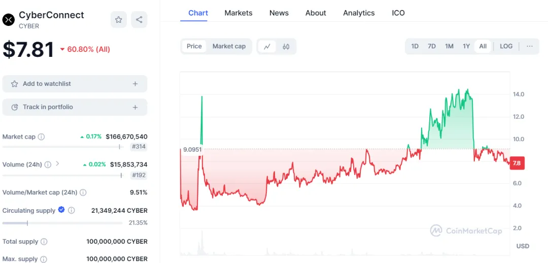 Cyberconnect代币发行时间超过两年,在上半年随着赛道炒作而价格增长,后面又跌回低点。