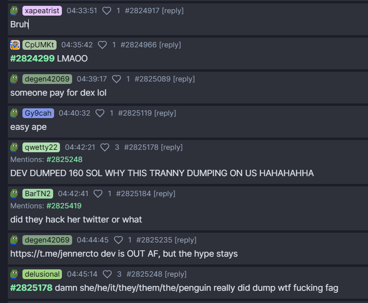 但机会是公平的,有人迟疑的时候,有人已经光速买入,上线半小时 $Jenner 已飙升 15 倍。就在价格不断冲高,玩家们紧张地买入时,Dev 抛售了价值 160SOL 的代币致使价格直接腰斩,霎时 pump.fun 的评论区嘲讽与骂声一片,玩家们更坚信这是黑客盗号后的把戏。