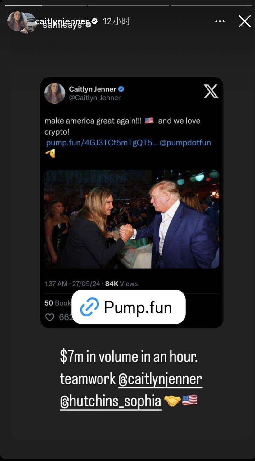 凌晨 4 点左右,Caitlyn Jenner 的推特账号 po 出一张与特朗普握手的照片配文“make america great again!!! and we love crypto!” 并附 pump.fun 的 $Jenner 代币链接。 紧接着 Caitlyn Jenner 又在推特上圈出 Ansem、SolJakey、Pauly 几位著名加密 KOL 并称其为“crypto kings!”。
