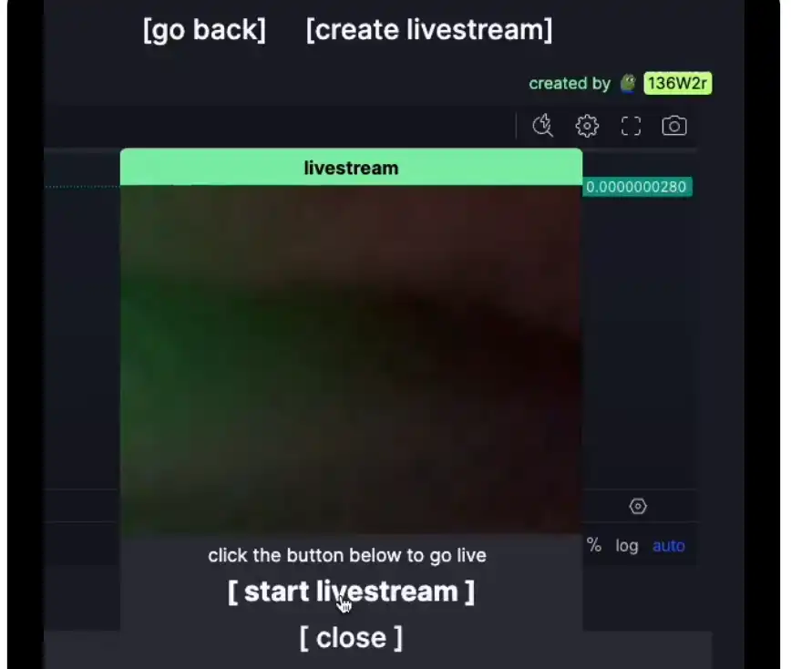 现在代币上线 Pump.fun 之后,价格图表的正上方会多出一个 [创建直播] 按钮,有点像你自己开了一个视频会议,然后可以先调整自己的声音和摄像头,随后点击开始直播即可实现 meme 带货。