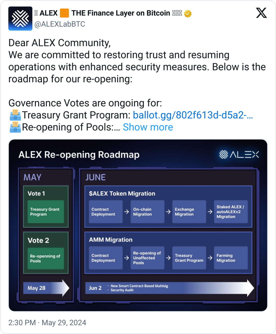 比特币第二层(L2)开发商亚历克斯实验室(Alex Labs)宣布了在最近的漏洞事件后恢复社区信任和重启平台运营的路线图。