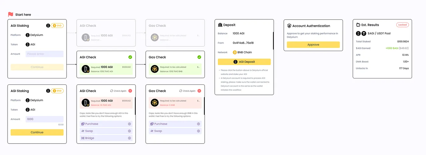 Lucy Beta 在这里创新性的定义和构建了一种由独立功能模块组成的工作流 (Flow) 来自动化和简化各种 Web3 操作的方式。通过将这些必要步骤和任务打包成简化的工作流程,Lucy Beta 能够更高效地完成从基础交互(如转账和质押)到复杂的各类链上和链下操作。