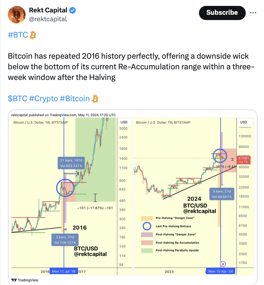 “Bitcoin has repeated 2016 history perfectly, offering a downside wick below the bottom of its current re-accumulation range within a three-week window after the Halving,” pseudonymous crypto trader Rekt Capital declared in a May 11 post on X.