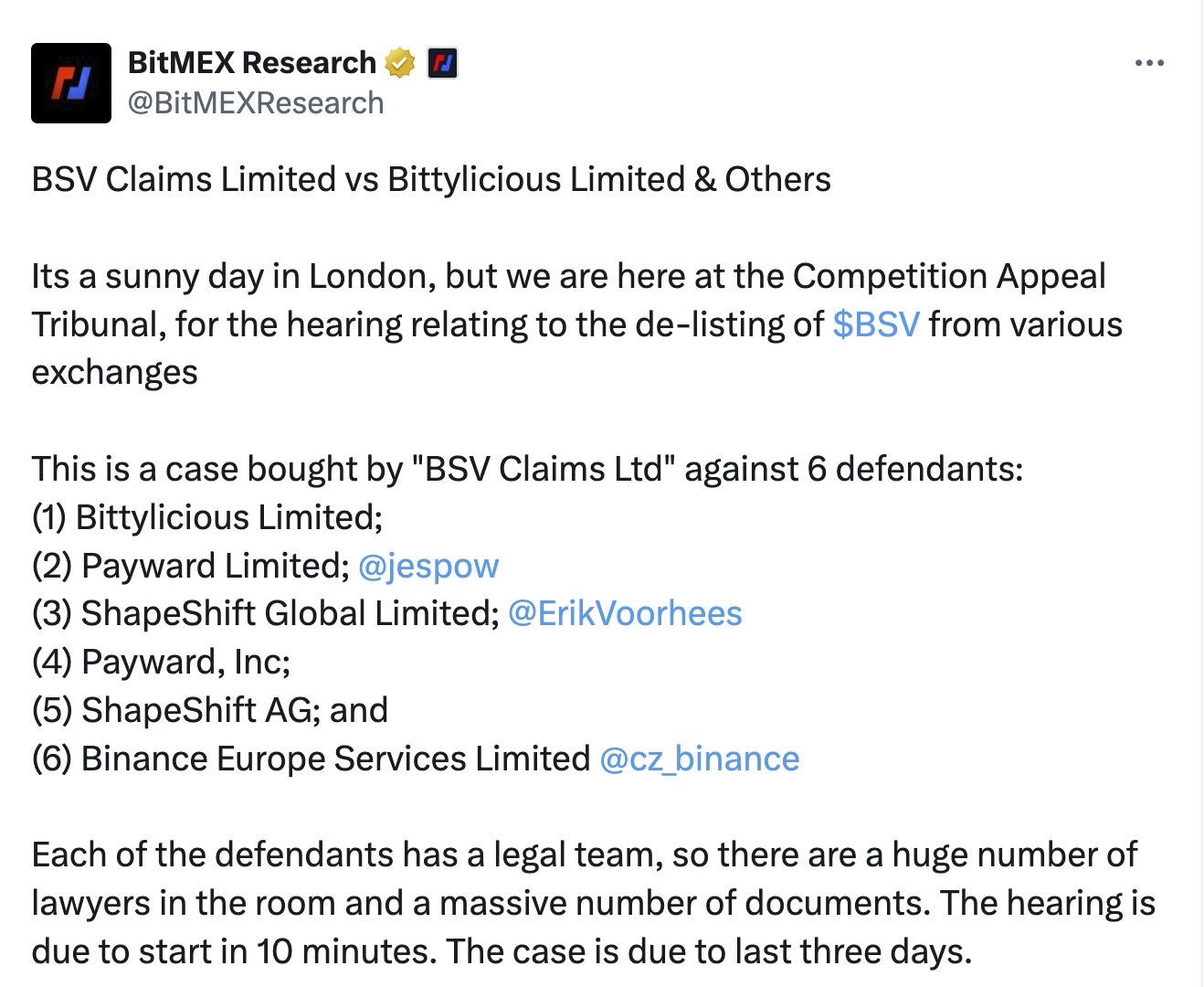 英国竞争上诉法庭于6月5日开始对2019年将分叉加密货币比特币SV(BSV)退市的六家交易所进行听证。