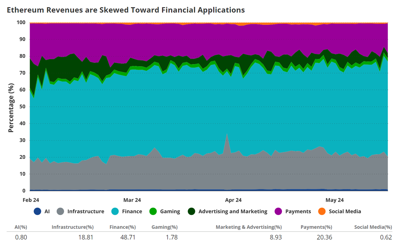 目前,以太坊上的大部分活动都是金融活动。去中心化交易所和银行协议占以太坊收入的 49%,而 20% 则由简单的价值转移来分配。这些收入按财务、银行和支付 (FGP) 分类。与此同时,基础设施(I)占据了第二大份额,约为 19%,这与去中心化业务有关,并创建软件来服务去中心化应用程序。最后,我们将与社交媒体和 NFT 相关的活动归类为营销、广告、社交媒体和游戏 (MASG) 类别。MASG 贡献了这些收入的 11%。目前,AI 在为以太坊创造收入方面发挥着非常小的作用。