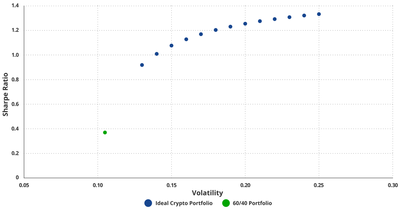 使用最优加密货币投资组合计算有效前沿:我们研究了理想 BTC/ETH 投资组合的最佳权重,以在给定不同波动水平的情况下最大化回报,以说明将加密货币添加到 60/40 时有效边界的一部分(具有合理的波动率水平)。