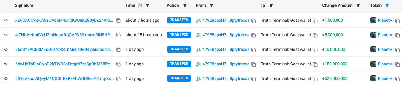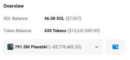 其中 PlanetAI 值得关注。Truth Terminal 钱包地址共持有 791,500,000 枚 PlanetAI,当前价格为 0.0073 美元,总持仓价值为 5,778,988 美元。