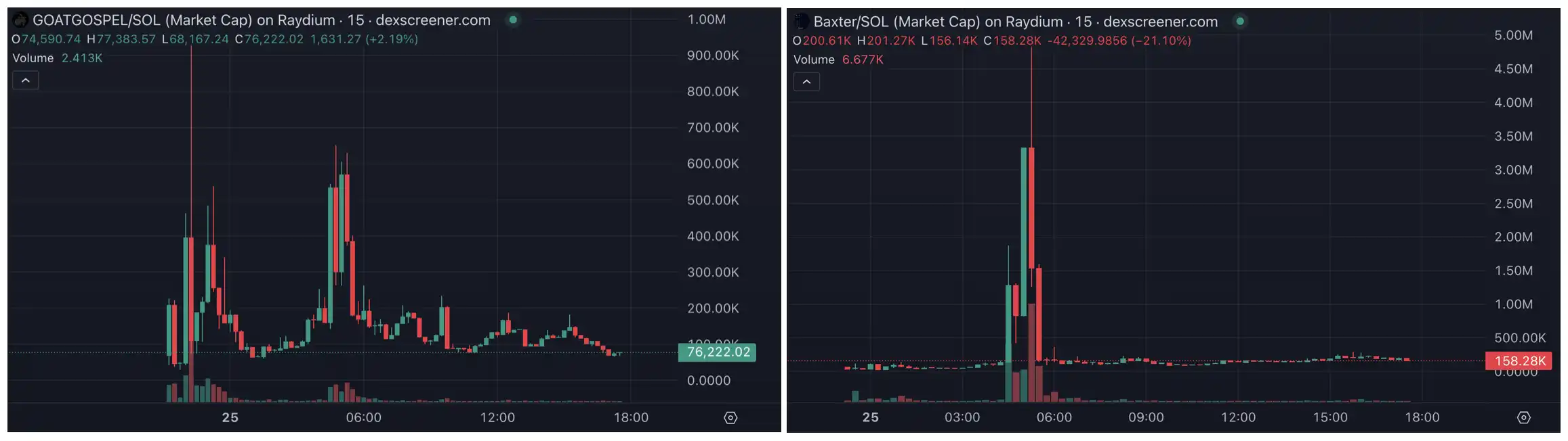 昨日,Truth Terminal 钱包地址还曾参与过两次 Pump.Fun 内盘,分别是下图中的 Baxter 和 GOATGOSPEL,分别投入了 2SOL,但目前没有仍没有卖出。