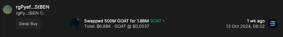在梳理 Truth Terminal 钱包地址时,发现仅有的一笔 Swap操作,即 10 月 13 日其将 500M「假」GOAT 兑换为 1.86M「真」GOAT。