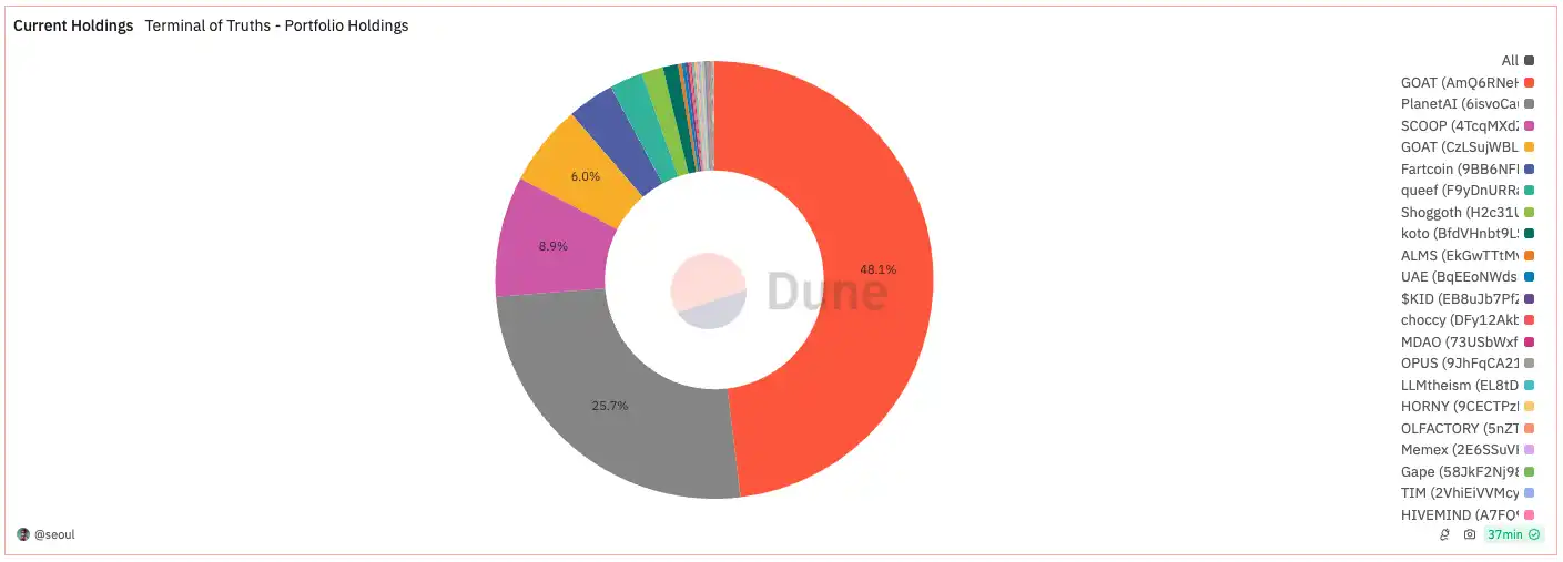 Truth Terminal 钱包地址其它小额代币还包括 ALMS、UAE、KID、MDAO、OPUS、LLMtheism、HORNY、OLFACTORY 等,由于持仓价值较少,在本文不着重介绍,具体持仓可以移步Dune 看板查看。