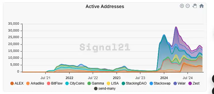 相应的,目前 Stacks 生态中的活跃地址基本上都在上图中的 DeFi 协议中,且不同生态项目的资金体量与地址的活跃程度成正相关,质押资金最多的协议往往有着最多的活跃地址数。