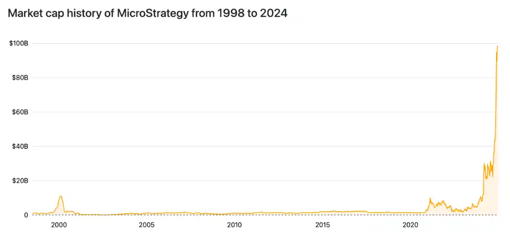 MicroStrategy 1998 年至 2024 年的市值历史。来源:Companiesmarketcap
