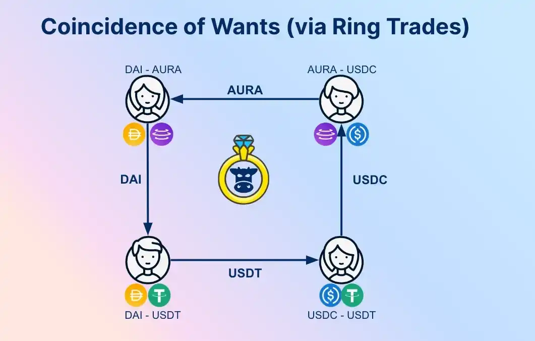 CoW 的第三个设计是链下批量交易,不仅可以找到「需求巧合」,还可以创建环形交易(Ring Trade)。环形交易在所有订单中共享流动性,而不是单个代币对。这使得协议能够将交易分解为多个部分,从而减少用户成本。