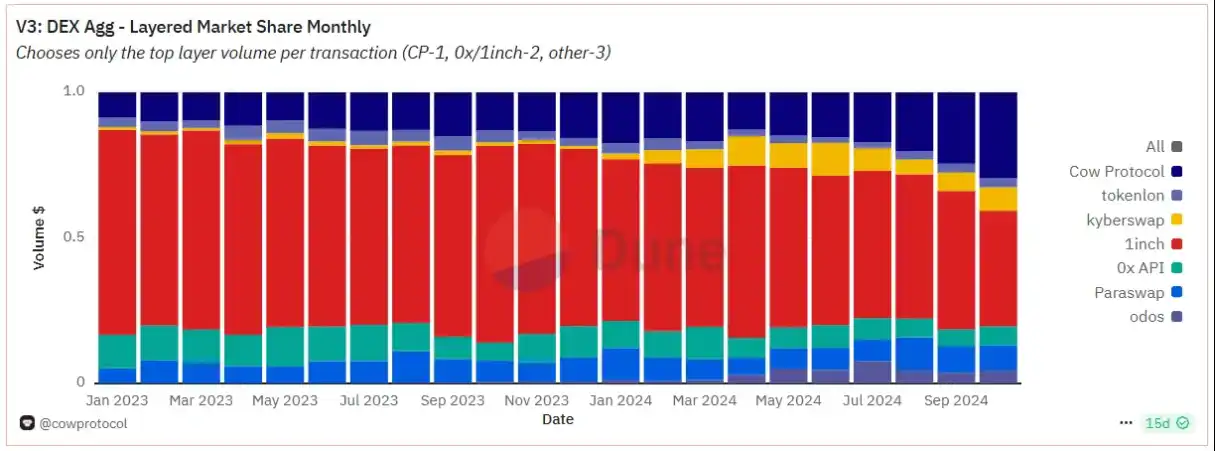 更令人瞩目的是,Cow Swap 在聚合交易领域的市场份额呈现出稳健的上升趋势。从年初的 17% 跃升至 30%,与行业龙头 1inch 的差距已缩小至仅 9 个百分点。然而,尽管 Cow Swap 展现出如此强劲的增长势头,其当前 1.4 亿美元的市值仍不足 1inch 的一半。这一显著的估值差异不禁引发了市场对 Cow Swap 潜在价值被低估的讨论。分析人士普遍认为,随着 Cow Swap 持续扩大其市场影响力并进一步完善其生态系统,其估值有望迎来显著提升。