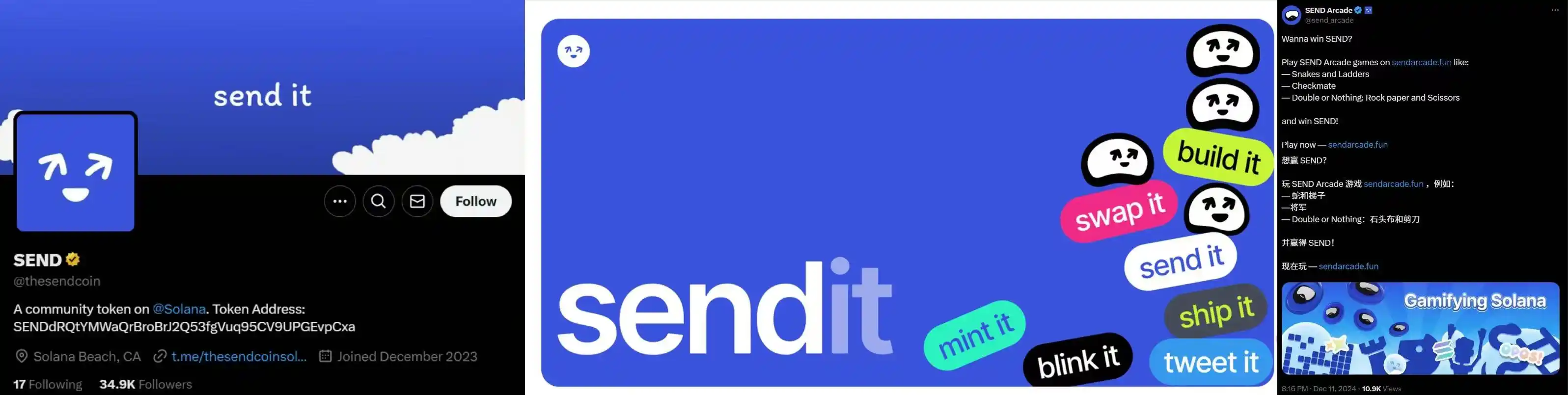 Send 代币是支持 Blinks 生态系统的社区代币,运行于 Solana 区块链上。SEND 作为一个集结点,可以推动 Solana Blinks 生态系统的进一步发展,连接 Solana 与整个互联网。用户可以通过 Backpack 平台玩多款小游戏,如抛硬币和猜拳赢取 SEND 代币。Send 代币也将在更多由 send arcade 开发的 Blinks 小游戏中发挥作用。