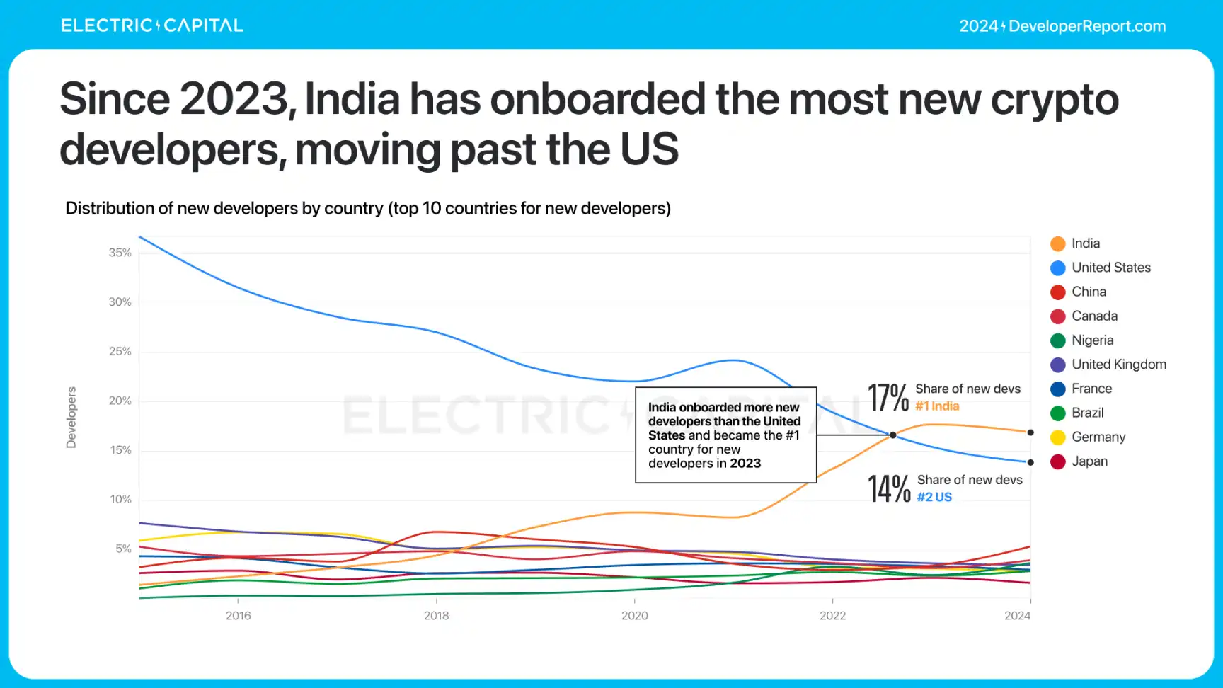 印度在 2024 年迎来了最多的新加密开发者。17% 的新加密开发者来自印度。