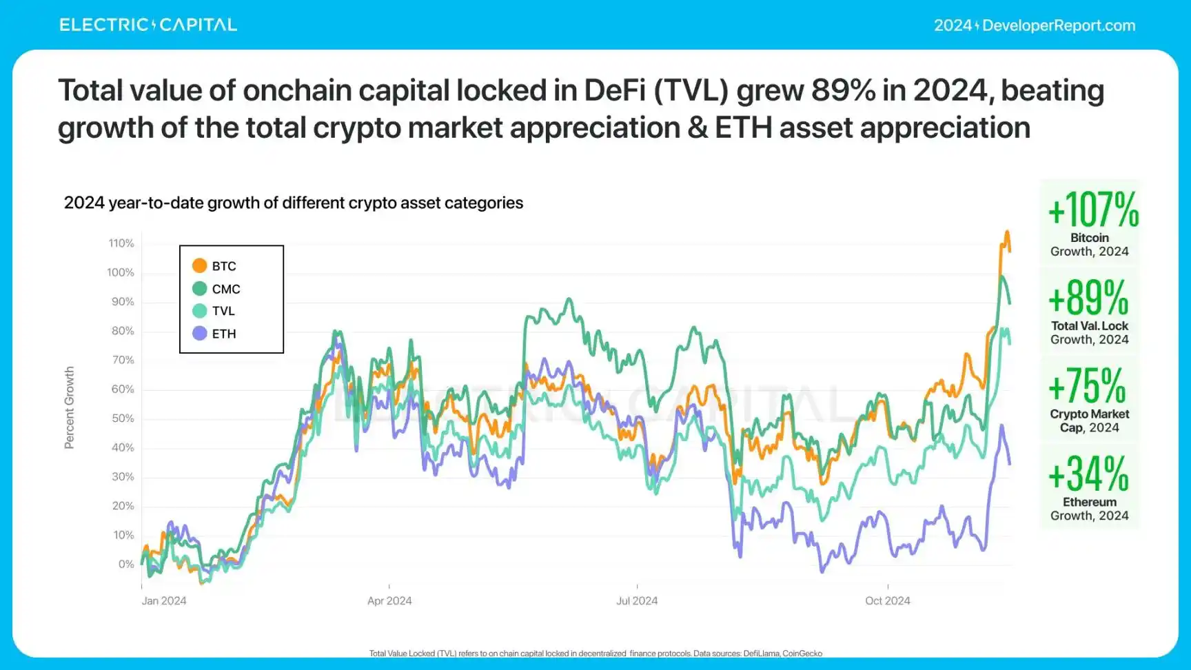 2024 年,DeFi 的总价值锁仓(TVL)增长了 89%。