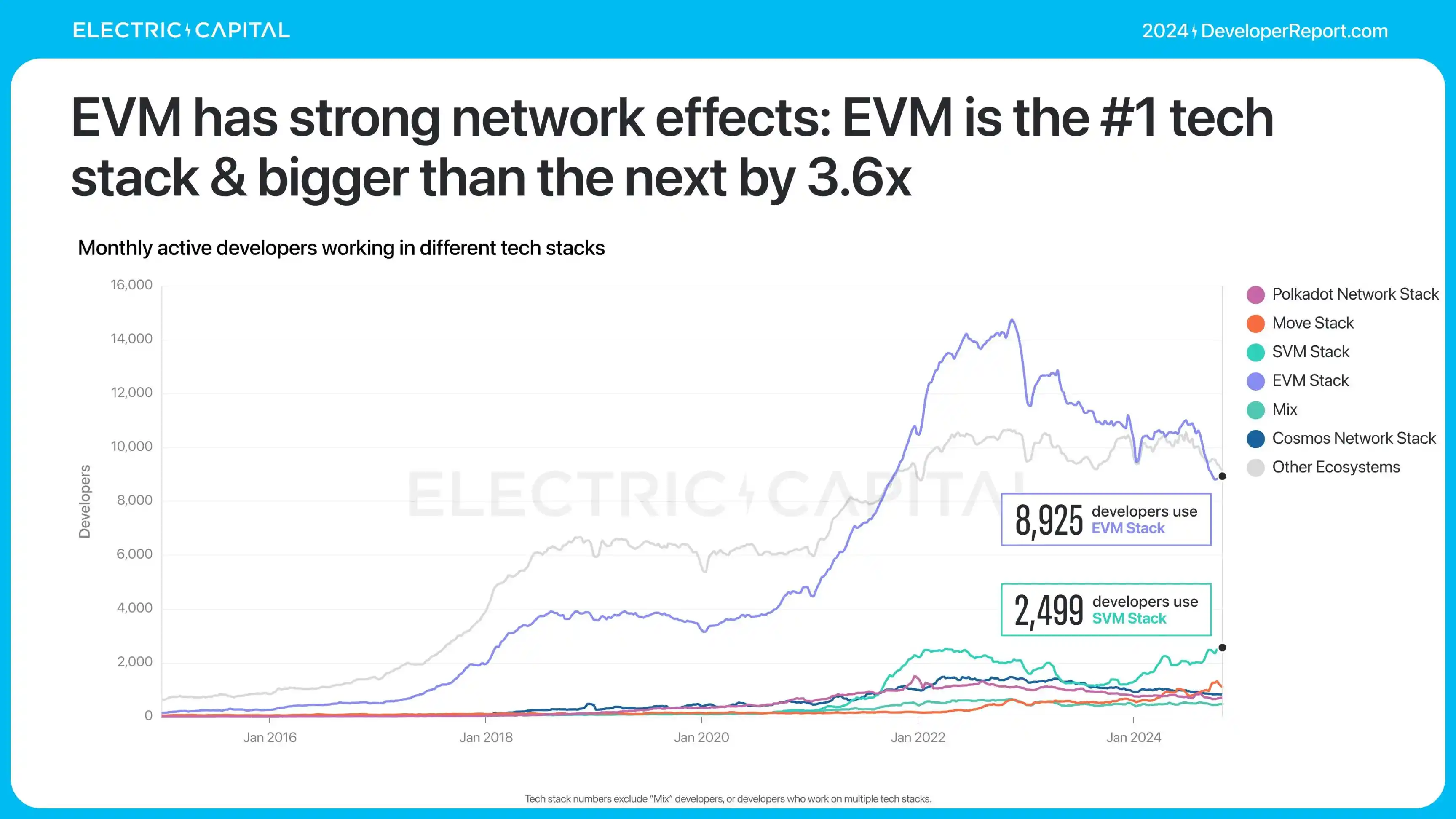 EVM 链共享了最多开发者,并且具有显著的网络效应:74% 的多链开发者在 EVM 链上工作。
