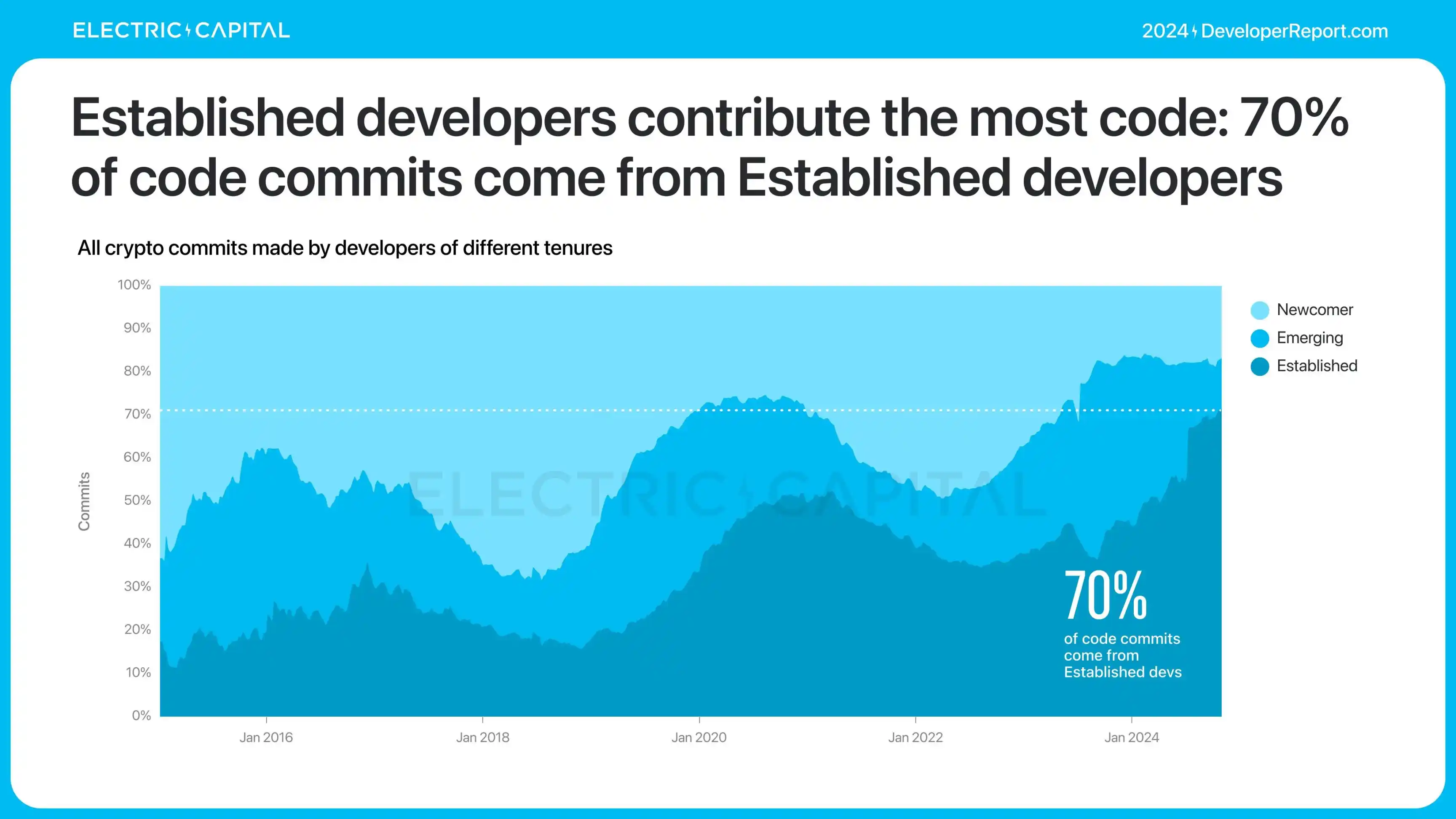 这些经验丰富的开发者推动了行业的发展,因为他们贡献了 70% 的代码提交量。