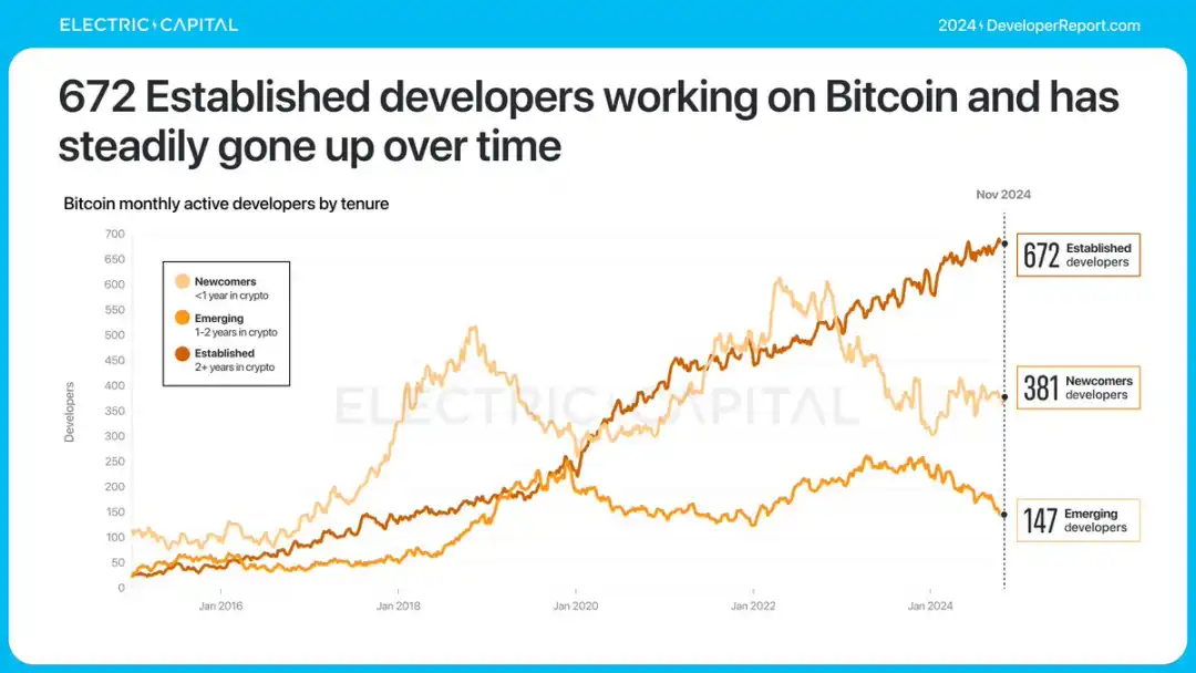 有经验的比特币开发者(从事比特币开发超过 2 年的)数量稳步增长。目前,每月活跃的有经验比特币开发者达到了 672 人,创下新高。