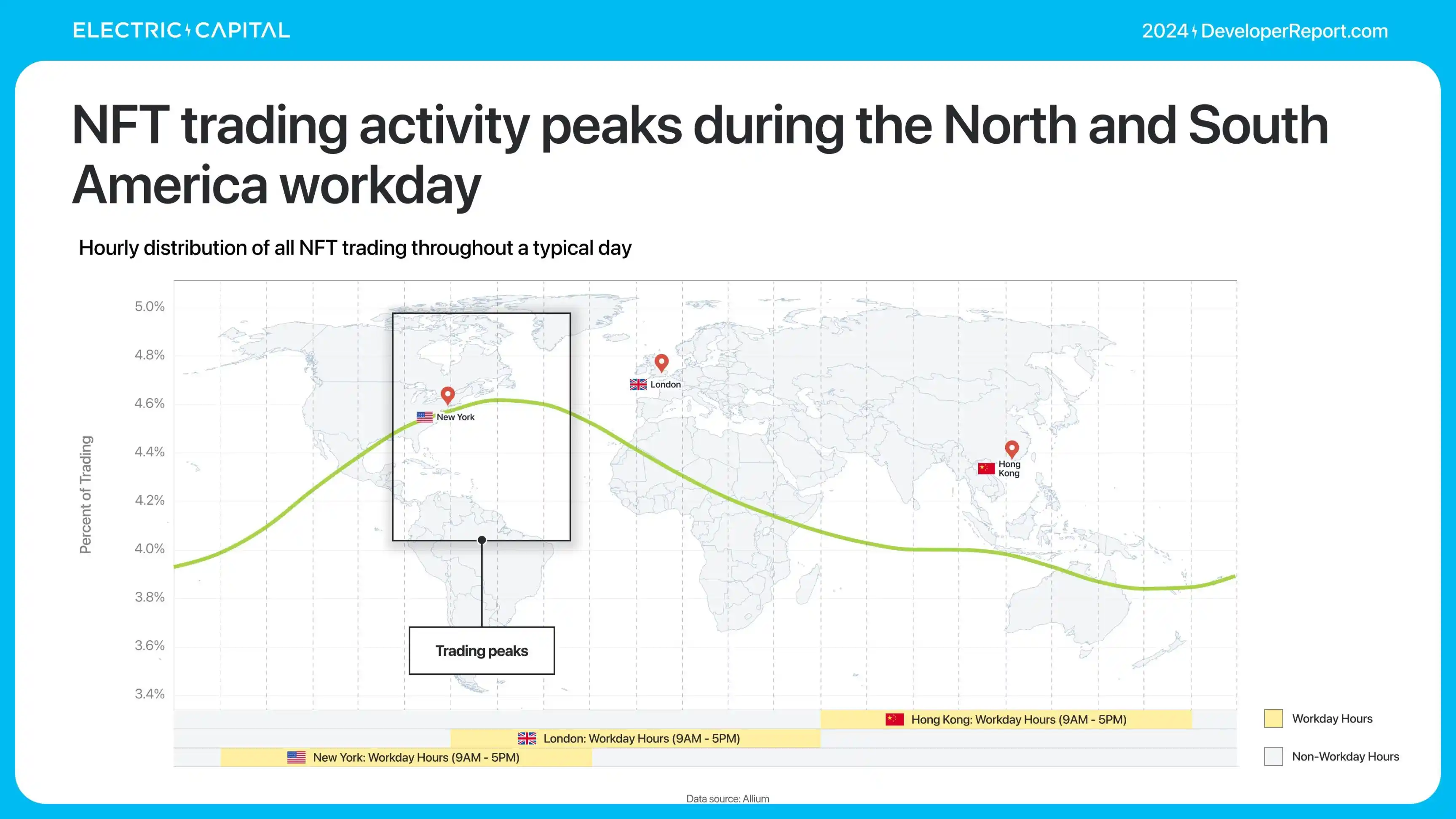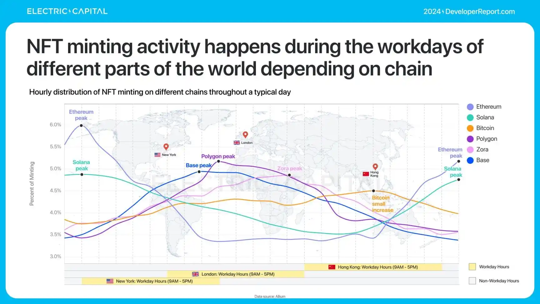 NFT 铸造和交易的交易量在不同地区达到峰值——这表明存在不同的用户群体。