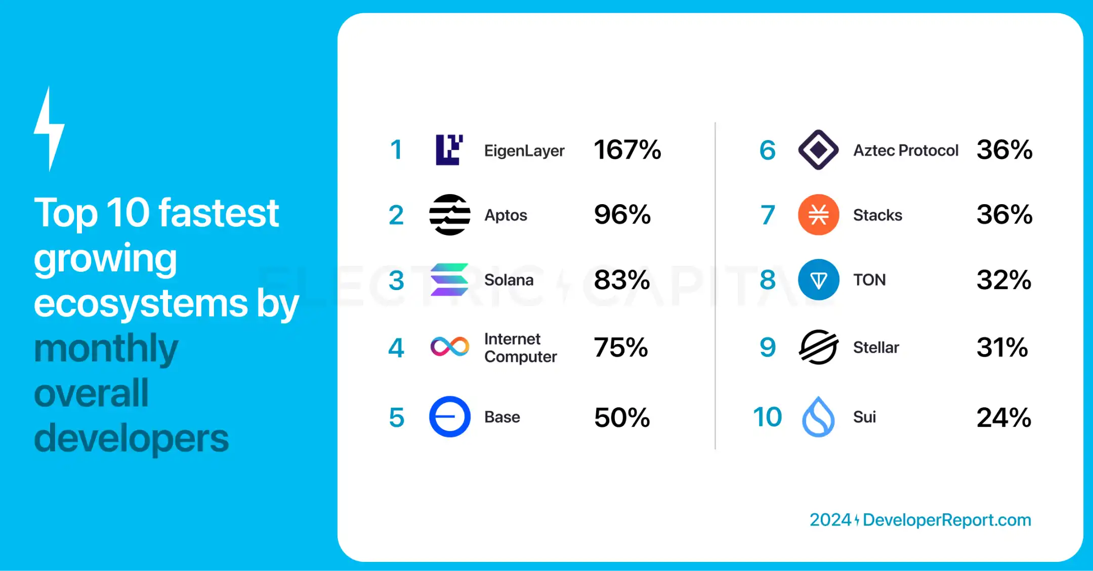 根据 2023 年第三季度和 2024 年第四季度的数据,开发者总数增长最快的十大生态系统是:
