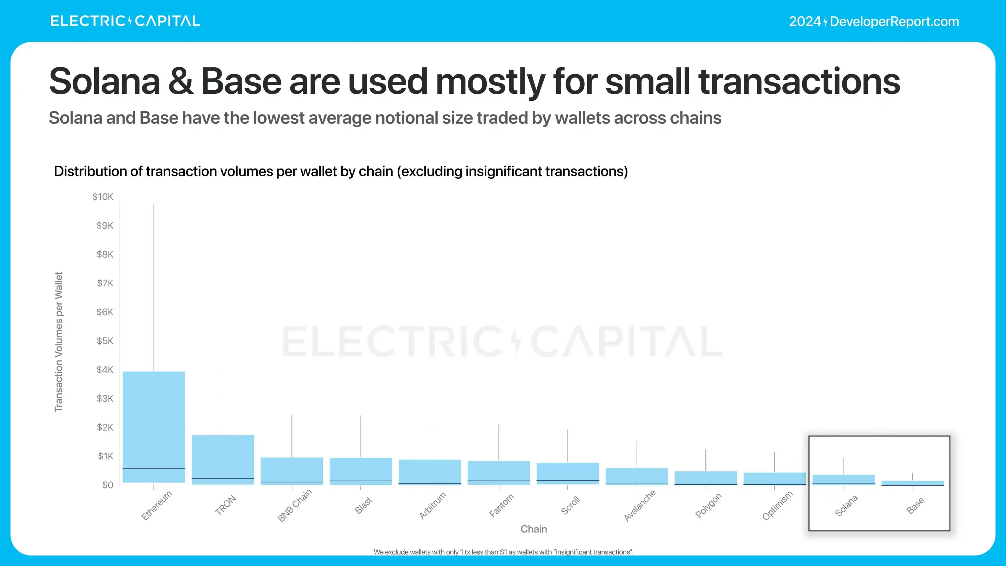 Base 和 Solana 在小额转账中非常受欢迎。这些链上的钱包交易的平均金额最小。