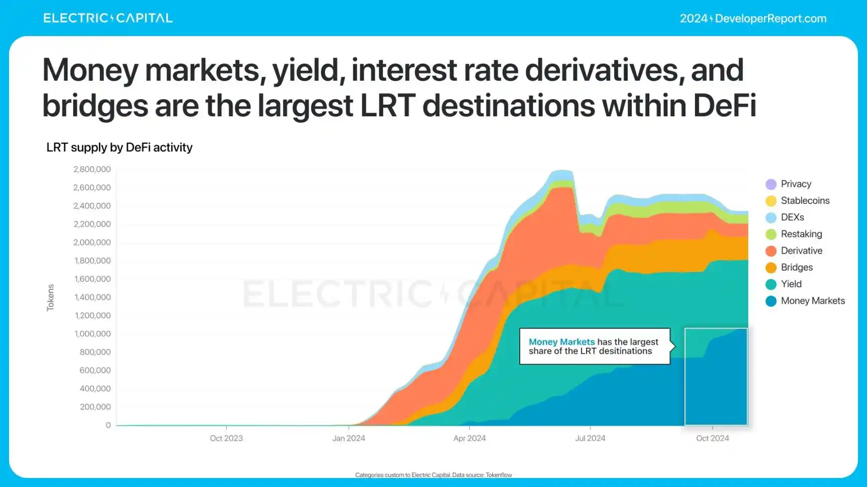 大多数 LRTs 被存入货币市场、收益、利率衍生品和桥接平台。