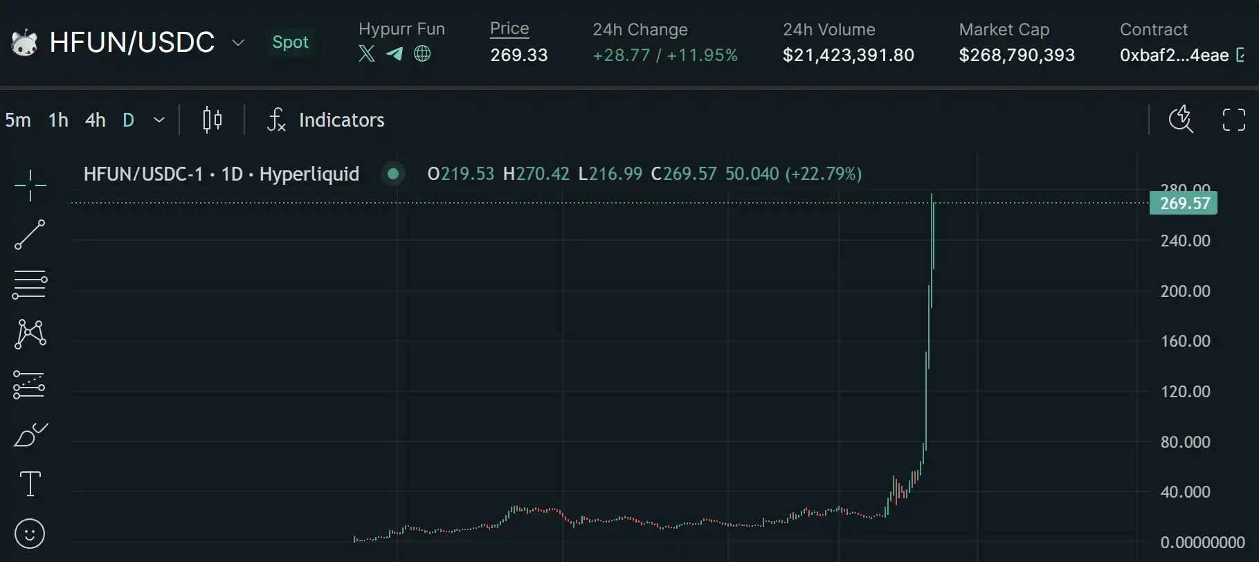 Hypurr Fun 是 Hyperliquid 上最快的电报交易机器人,而 HFUN 是 Hypurr Fun 的平台代币。在 12 月 5 号之后被价值发现,随后一路新高,10 天涨幅高达 1500%。