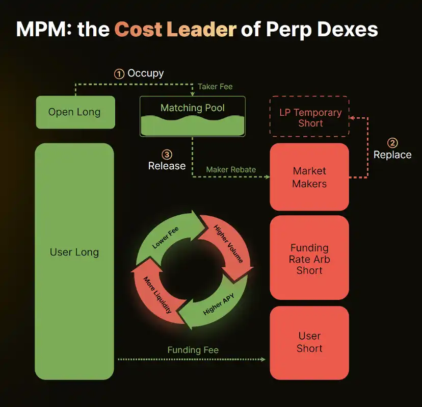 针对链上交易环节的流动性问题,MYX Finance 给出的答案是 MPM(Matching Pool Mechanism)做市机制——MYX Finance 在引入流动性池的基础上,利用资金费率和 Maker rebate 来平衡多空双方的利益——在资金费激励下,多空双方的未平仓合约数量比例往往会接近 50:50,以解决长期持仓不平衡问题,通过 Maker rebate 引入高频做市商,MYX 也解决了中高频用户造成的不平衡问题。