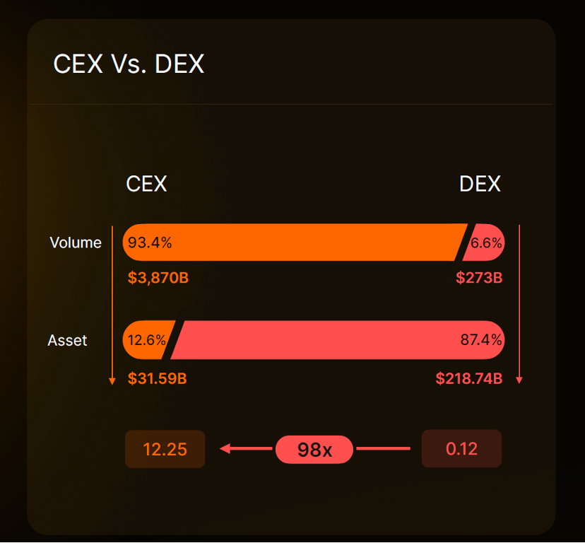 其次,从加密市场的存量资金数据来看,加密用户在 CEX 中的资产约 315.9 亿美元,仅占总资产的 12.6%,而这批用户在 CEX 上的现货月交易量却高达 3.87 万亿美元,占总交易量的 93.4%——与之相对的,加密用户有 2817.4 亿美元存在链上,占加密总资产的 87.4%,但发生在链上的现货月交易量却只有 2730 亿美元,是总交易量占比的 6.6%。资产和交易量的的「错配」,让我们看到,CEX 仍然是加密用户的交易主阵地,而 DEX 更多是处于「试验田」的定位——而如果 DEX 能够在吞吐量、用户体验、可拓展性等方面取得突破,优化用户交易体验,链上资产必然将省去提币至 CEX 交易的冗余步骤,直接在 DEX 进行交易,而去中心化 DEX 就能兑现链上巨量资产的潜在交易市场,迎来一波巨幅增量。