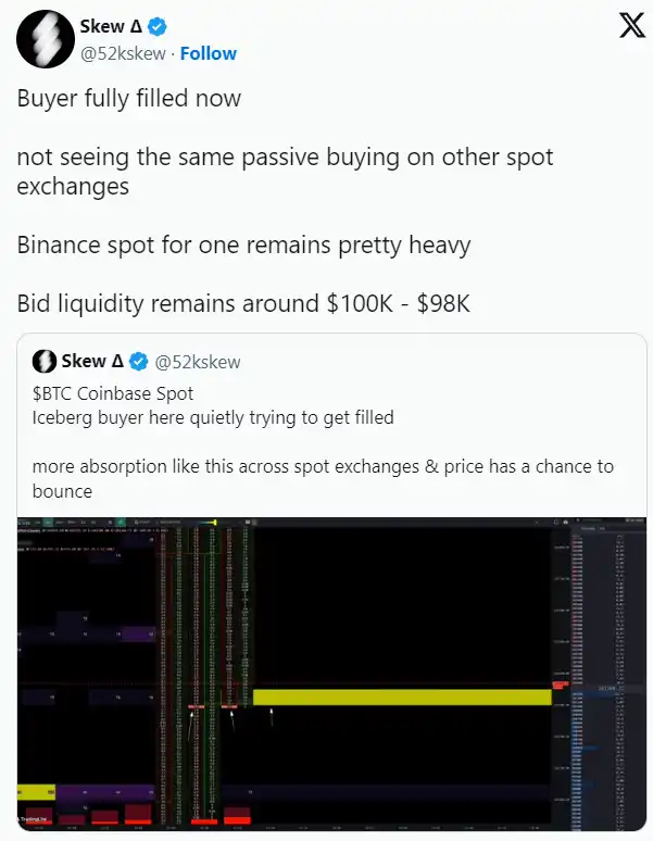 加密货币分析师 Skew 指出,比特币的快速下跌清除了市场中的多头和空头头寸,显示出市场进入深度调整期。比特币价格一度跌至 100,000 美元至 98,000 美元的关键竞标区间,分析师认为,若不能在每日收盘前重新收复 100,000 美元至 101,400 美元的支撑位,市场可能继续向下寻找新的底部。