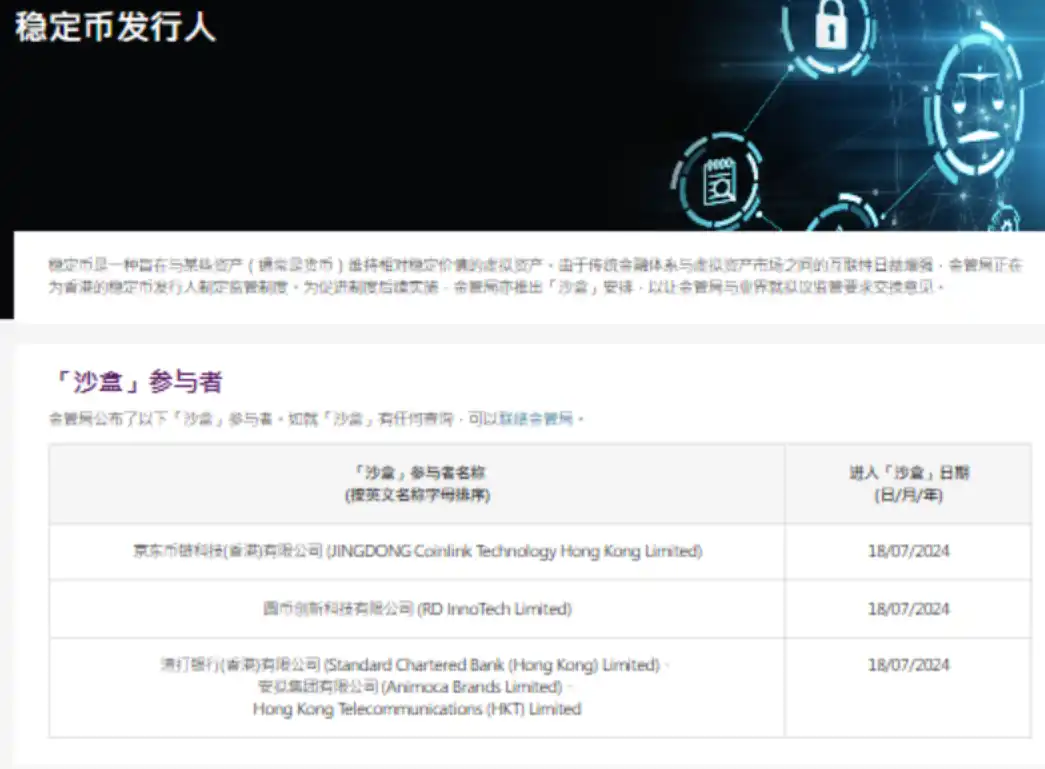 此外,金管局还推出了稳定币发行人「沙盒」计划,以便与业界就拟议监管要求交换意见。首批参与者名单已于 2024 年 7 月 18 日公布,包括京东币链科技(香港)有限公司、圆币创新科技有限公司,以及由渣打银行(香港)有限公司、Animoca Brands Limited 和香港电讯有限公司组成的联合体。