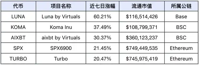 过去一周市场代币涨幅前 5 名(未计入交易量过小的代币和 meme 币),数据来源:Coinmarketcap