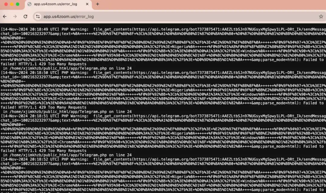 通过对上述域名探测,我们发现了黑客的监控日志地址 (https[:]//app[.]us4zoom[.]us/error_log)。
