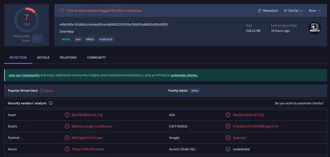 我们将该二进制文件上传到威胁情报平台分析,发现该文件已经被标记为恶意文件。