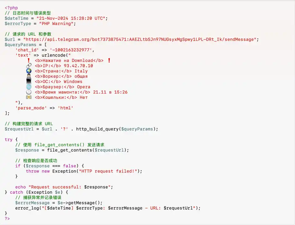 解密发现,这是脚本尝试通过 Telegram API 发送消息时的日志条目,使用的语言为俄语。