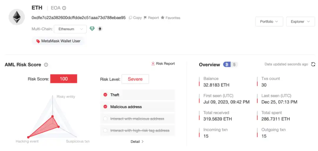 新地址(0xdfe7)的首笔交易时间为 2023 年 7 月,涉及多条链,目前余额为 32.81 ETH。