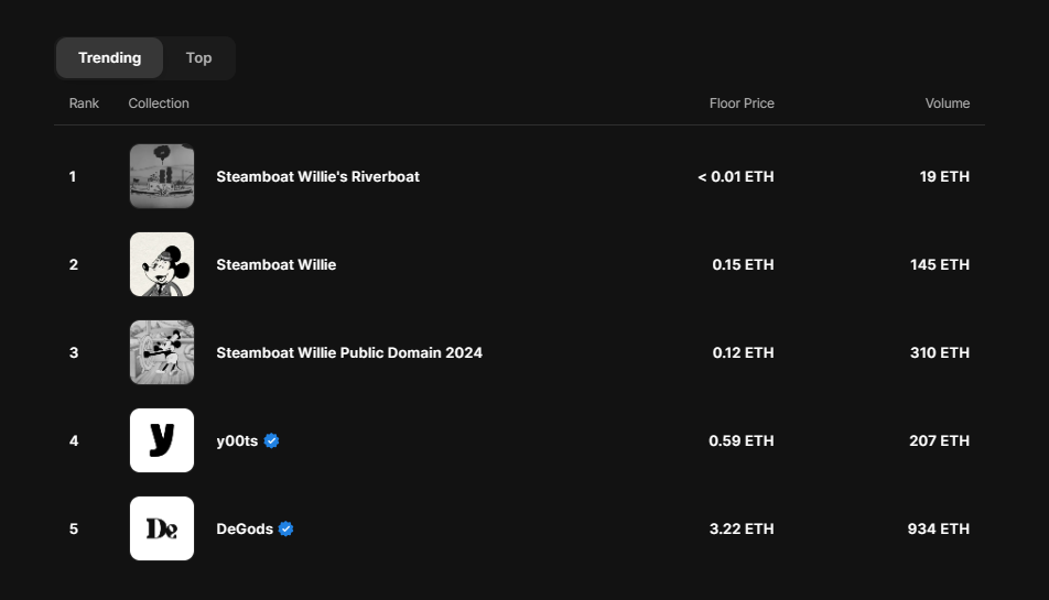 以太坊 NFT 以「复古米老鼠」开始了这一年。因美国法律只允许拥有 95 年的版权,在今年的 1 月,老版米老鼠版权已不属于迪士尼所有,转为向公众开放。于是我们就在 OpenSea 上看见了「米老鼠」的霸榜。