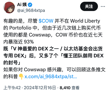 最近,中文社区里一则关于特朗普团队的 DeFi 项目 World Liberty Financial(WLFI)的链上动态吸引了市场目光。尽管 WLFI 的资产列表中并不包括 $COW,但据链上分析师 Ai 姨说,WLFI 近几次代币购买都使用了 CowSwap。这与以太坊创始人 Vitalik Buterin 常用 CowSwap 的习惯不谋而合。
